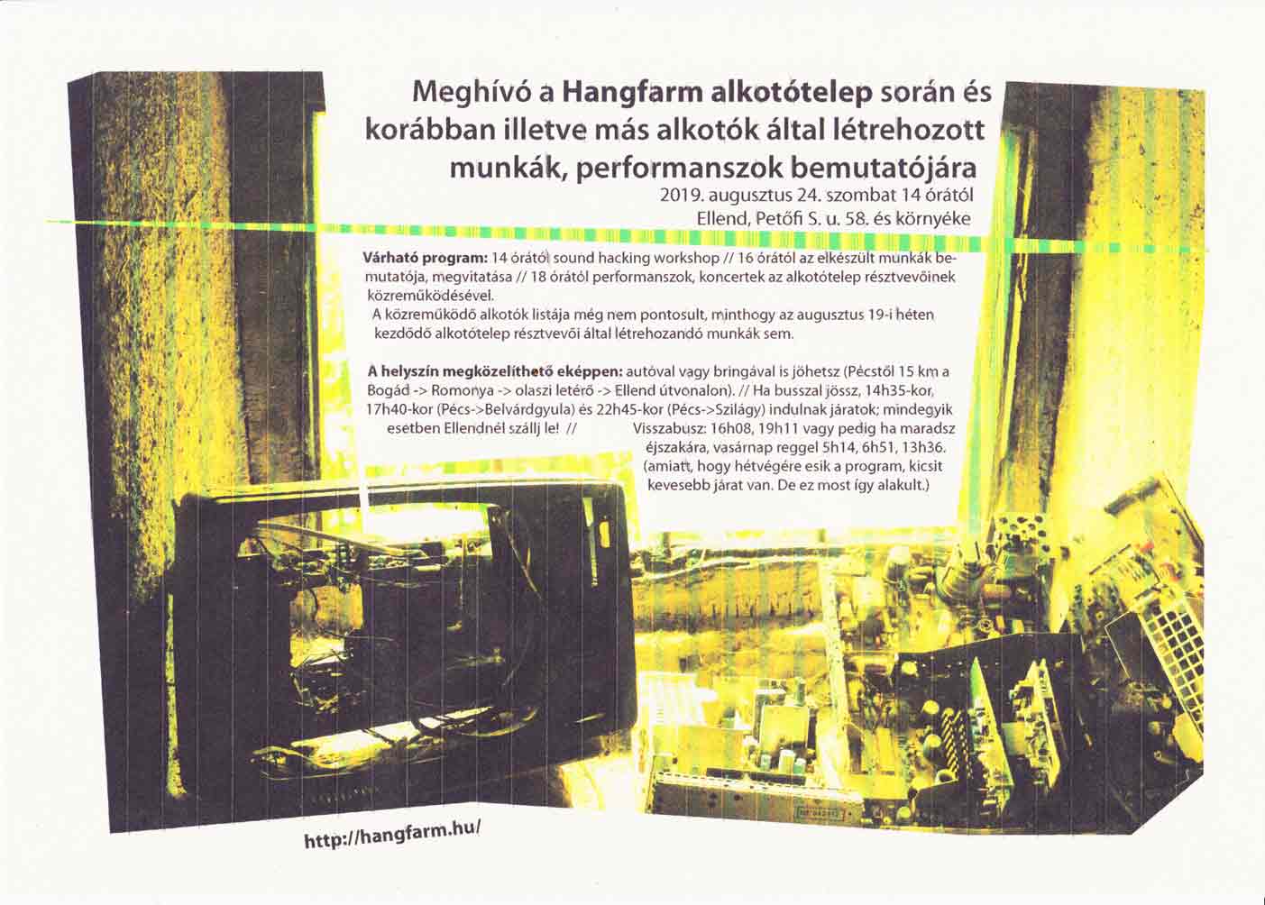 Tavaly egész délutános-estés programra invitált minket a pécsi Szabadkikötő, azzal a céllal, hogy bemutassa munkáinkat és a hangfarmon tevékenykedő alkotókat a városi közönségnek is. Minthogy a program egész sikeres volt és igazán tartalmasra sikerült, ezért idén is megpróbáljuk, mégpedig az alábbi programmal: